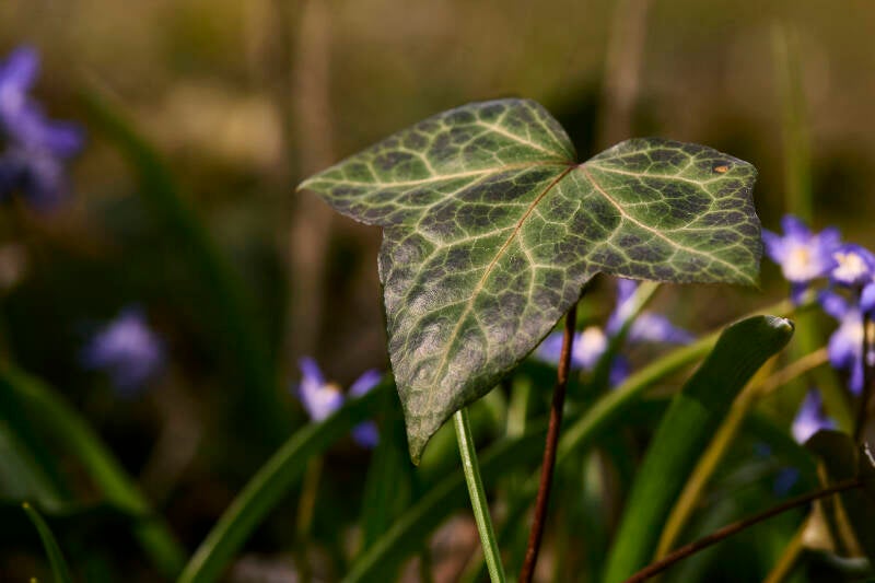 Im unteren Bild habe ich den Spieß umgedreht: Die unscharfen Blausterne hinter dem Efeublatt erscheinen nur als farbige Punkte, bringen aber Leben ins Bild und bilden einen schönen Kontrast zum Grün des Efeus. Das ist Frühling – wieder mehr Farbe, und die Kreativität ist auf einem anderen Level.